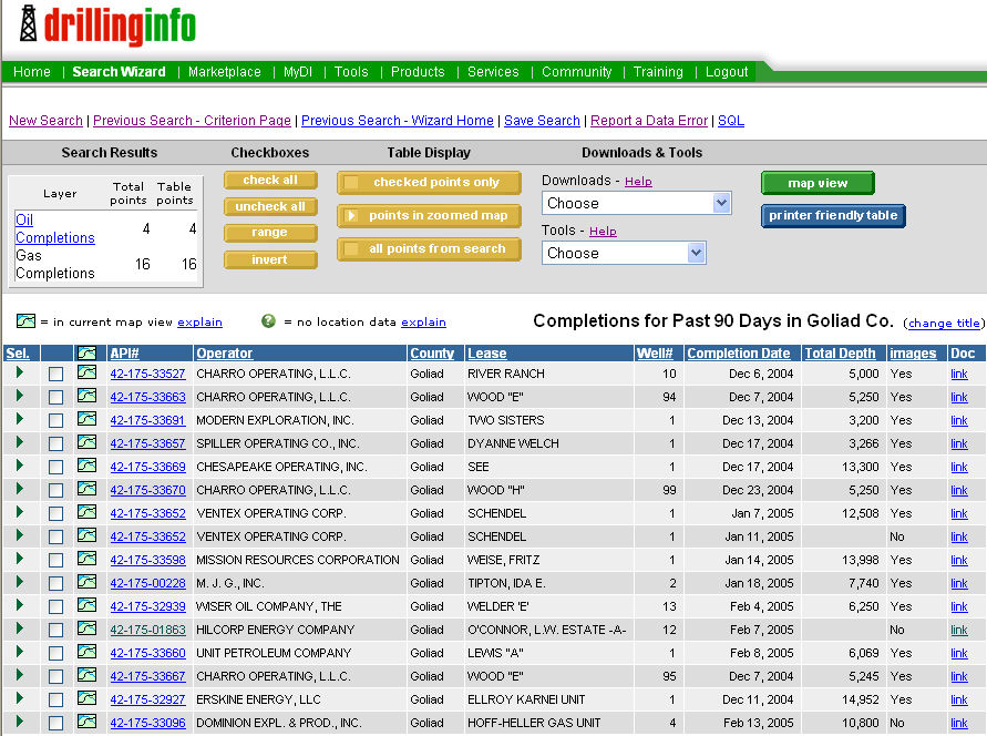 An example of a search for both oil and gas completions in Goliad County, TX for the time period 12/1/2004 to 3/1/2005 is shown below. This search returned 9 oil completions and 59 gas completions. The example is for the gas completion part of the table.